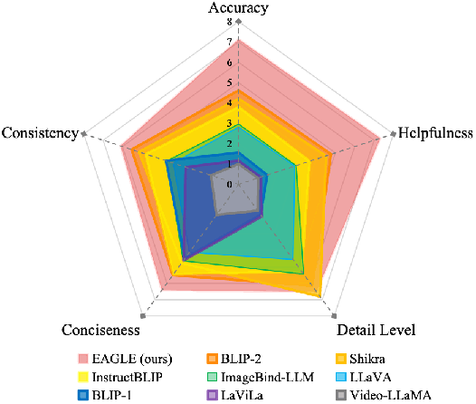 EAGLE demonstrates superior performance across all evaluation dimensions compared to existing multimodal large language models. The model shows particular strength in understanding temporal sequences and identifying procedural knowledge, which are critical aspects of egocentric video understanding. This comprehensive evaluation validates EAGLE's effectiveness as a specialized tool for egocentric video analysis.