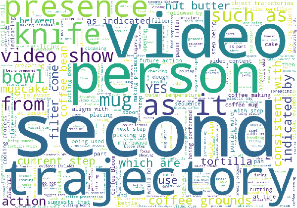 Response pattern analysis showing the language characteristics of EAGLE-400K dataset responses. The word cloud reveals emphasis on phrases like "consistent with", "as indicated", "suggests that", and "aligns with" which demonstrate the model's analytical approach. The responses focus on temporal relations with terms like "current step", "future action", and "making process", indicating comprehensive understanding of sequential activities and procedural knowledge in egocentric videos. in the question prompt activates additional attention heads not triggered by the visual prompt, suggesting that the attention heads exhibit dynamic activation based on the context—whether visual or linguistic. This highlights their ability to adjust their function and behavior in response to changing inputs. Further comparison between versions 1.6 and 1.5 demonstrates an improvement in image attention across all layers in version 1.6. However, this pattern is not as evident in the 1.6 13B model. The region token attention is omitted in 1.6 due to the more complex handling of the input image, making it challenging to track bbox token indices. Additionally, we see that the visual prompt does not improve the attention head’s focus on specific regions, as evidenced by comparing the first and second rows of the heatmap.
